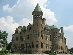 Old Frankfort Stone High School, also known as Old Stoney, is a historic high school building in Frankfort, Clinton County, Indiana. It was built in 1892, and is a 2+1⁄2-story, Richardsonian Romanesque style sandstone building on a raised basement. It has Indiana limestone trim, a large round arched entrance, four large stone chimneys, and four-story corner tower with a tall conical roof. The building was damaged by fire in 1922, and rebuilt with the work completed in 1926. The building housed a junior high school from 1962 to 1974, after which it ceased use as a public school.[2]: 2–3