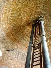 The structure is an example of American Romanesque architecture. The tower stands 109 feet (33 m) tall, with a 250,000 US gal (950,000 L) water storage tank. The tower has a 2-foot-thick (61 cm) inner wall and a 14-inch (36 cm) outer wall, separated by a 3-foot-wide (91 cm) space. The exterior brick is painted.[2] Because the third story was never built, the second story had a very high ceiling.[4] About halfway up the tower is a balcony decorated with elaborate iron corbels.[10][11] The roof is made of tile.[11]