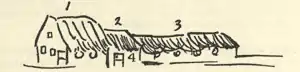 There are a variety of types, but most have vanished during time. The only remaining longhouse is located in the Dutch village Wartena. One of the oldest reminding of this type of residence comes from an undated writing from around 1850 from J.H. Halbertsma, the Lexicon Frisicum (A and B). Halbertsma made an untidy schematic drawing that shows the lines of the outer walls of a longhouse.