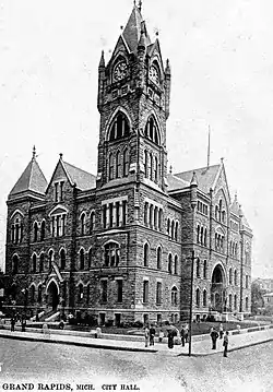 The old Grand Rapids City Hall was designed by architect Elijah E. Myers. Construction began in 1885, supervised by W.D. Richardson of Springfield, Illinois. The building was dedicated in 1888, having cost $314,800 to construct. After extended efforts to save the building, it was demolished in 1969.[2][3] At the same time the International Style current city hall was built at 300 Monroe Ave NW. In 2001, the current Kent County Courthouse was built on the former site, with a new clock tower outside the building.