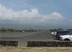 During World War II, a small landing strip was cleared near the end of Kuakini Highway. In 1947, the State of Hawaii approved a small passenger terminal and a 3,800 foot (1,200 m) runway to be built for tourist flights, which was operational in 1948 and dedicated in 1949.[1] In 1950, 5,000 feet (1,500 m) of fencing was added to keep out cattle which would wander onto the site. The 1960s brought development of several larger hotels and resorts in the Kailua-Kona area. During the early 1960s, Aloha Airlines and Hawaiian Airlines were operating nonstop flights to Kahului on Maui, nonstop and direct flights to Honolulu on Oahu and direct flights to Lihue on Kauai, Aloha with Fairchild F-27 turboprop aircraft and Hawaiian with "Super" Convair 340 prop aircraft.[2][3] Larger aircraft such as the Boeing 707 and Douglas DC-8 could not take off from the short runway; however, Aloha Airlines and Hawaiian Airlines were both operating jet service from the old airport during the late 1960s with flights to Honolulu, Kahului and Lihue, Aloha with the British Aircraft Corporation BAC One-Eleven and Hawaiian with the Douglas DC-9-10 with both airlines also operating turboprop aircraft as well at this same time, Aloha with the four engine Vickers Viscount and Hawaiian with the Convair 640.[4][5] When the much larger Kona International Airport was built further north at Keahole Point in 1970, Aloha and Hawaiian moved their airline flights to this new airfield and the old landing strip was then used for drag racing before being turned into a state park in 1976.[6] The original airstrip was called Old Kona Airport post facto.
