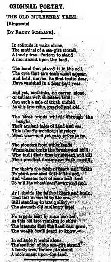 - Cordes, Dene (27 April 1983). "The Old Mulberry Tree - is it about to give up its 147 year secret?". The Islander.