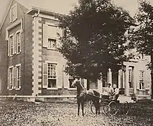 Old Oaks is a brick transitional Greek Revival & Italianate style 33-room residence, that was commissioned by Dorell B. Smith and was likely completed sometime around 1872. Built on a raised limestone foundation, the eastern facing entrance façade is a two-story, five-bay temple form elevation with a side-facing gabled roof, with four French end chimneys. A central two-story pedimented portico in the Greek Revival-style has been altered from its original configuration of a double-story porch into a colossal style columned portico. The two-story portico contains four, square Doric columns with smooth shafts. An added iron balcony is mounted to the second floor facade porch door replacing an earlier second level porch. Old Oaks mansion has various components of Minard Lafever’s patterns from Lafever’s book, The Modern Building’s Guide published in 1841, including the egg-and-dart surround of the front entry door, the engaged pilasters and arrangement of the pocket door surrounds in the parlor and dining rooms, in the buildings door leafs, door casings, and in the arrangement of the facade’s second-story doorway. The building also possesses Italianate features in the form of its paired windows, original quoin corners, and bracketed eaves on the south and north elevations. A singular Gothic Revival influence is located in the form of its pointed arch window located in the original porch pediment. [1]