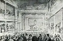 Palmer obtained a royal patent in 1768 which enabled the use of the title ‘Theatre Royal’; the first to achieve this outside London.[2][8] He handed control to his son, also John Palmer who worked as his father's London agent, frequently travelling between London and Bath.[9] Palmer also owned the Theatre Royal, King Street, in Bristol, which now houses the Bristol Old Vic. The two theatres shared one acting company, so Palmer had to move his actors, stagehands and props quickly between Bristol and Bath, he set up a coach service which provided safe, quick and efficient transport for his actors and materials. Later, when Palmer became involved in the Post Office, he believed that the coach service he had previously run between theatres could be utilised for a countrywide mail delivery service.[6] He continued to manage the theatre until 1785 when he was appointed as Comptroller-General of the Post Office,[10][11] and handed control to two existing members of the company, William Keasberry and William Wyatt Dimond.[5] Keasberry (1726–1797) was associated with the theatre as actor and manager from 1757 to 1795,[12] first acting as manager during the season of 1760.[13]