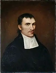 The hill belonged to John Parker, a prominent merchant from nearby Perth Amboy and was the site of an apple orchard. His heirs, including James Parker, Jr. (1776–1868), a local merchant and political figure, donated this orchard to the trustees of Queen's College (later renamed Rutgers) in 1808.[11] James Parker, Jr., a graduate of Columbia College (A.B. 1793) in New York, was a member of the New Jersey General Assembly, and later became a trustee of Queen's and later Rutgers College starting in 1812 and serving until his death in 1868. The college, which had closed in 1795 due to financial reasons, reopened in 1807 after a long fundraising campaign led by the Rev. Ira Condict (the school's third president, pro tempore) and the Rev. John Henry Livingston (the college's fourth president and founder of the New Brunswick Theological Seminary) with direct support from the Dutch Reformed Church's Synod of New York. The funds would be appropriated to build a permanent home for Queen's College, its grammar school (which remained open for the years the college closed), and Livingston's theological seminary which was permanently relocated to New Brunswick from New York.