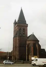The church is built in red brick with some dressings in blue brick and it has a slate roof. Its plan consists of a six-bay nave without aisles, an apsidal chancel, north and south porches, a north vestry and a southeast tower. The tower is in the angle between the nave and the chancel and in three stages. In the lower stage is a single lancet window and in the second stage are three similar windows. The third stage contains pairs of louvred bell openings and above these is a corbelled parapet. On the southwest corner is a stair-turret rising to the height of the tower and capped by a tall conical-roofed turret rising above the parapet. On top of the tower is a tall steeply-pitched saddleback roof.[1] In the sanctuary (but currently obscured) are paintings of The Evangelists by Westlake, dated 1868, which were repainted by T. Hesketh in 1894.[2]