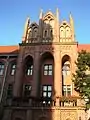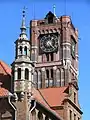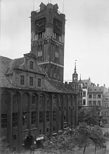 The present shape of the city hall is a result of an extensive construction project from the years 1391-1399, carried out in the Gothic style, probably under the direction of the Polish town constructor, master Andrew, based on the privilege of grand master Konrad von Wallenrode from 1393 (the privilege was issued during the construction). Old commercial buildings were demolished at that time, leaving only the tower. The administrative, commercial and judicial functions were combined in one building, which was a unique solution in Europe at the time. The city hall took the form of a four-winged building on a 44 × 52 m rectangular plan, with an internal courtyard accessible through four gates in the middle of each wing. The tower was based on the Flemish beffroi towers.[1] It was covered with a high Gothic roof (destroyed in 1703), which was a distinctive element of the former skyline of the city.