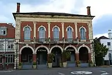 In the middle of the 19th century civic leaders decided to replace the second market house with a new structure. The new building was designed by George Briand in the Italianate style, built in red brick with stone dressings at a cost of £1,700 and was completed in 1851.[4][5] The design involved a symmetrical main frontage with five bays facing onto London Road; it was also arcaded on the ground floor, so that markets could be held, with an assembly room on the first floor. There were five round headed windows on the first floor with a projecting balcony in front of the central three windows.[1] The windows were flanked by pilasters supporting an entablature and a dentilled cornice.[1] Internally, the principal room was the assembly room which was accessed by a grand staircase.[4] Petty session hearings were held in the assembly room on alternate Wednesdays.[6]