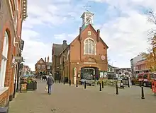 The first municipal building in the town was a timber-framed market hall which dated back to the 16th century.[2] It was arcaded on the ground floor, so that markets could be held, with an assembly room known as the "jury loft", which was used for petty session hearings, on the first floor.[3] The building had a clock on the gable at the west end and was surmounted by a bell tower.[4] It was owned by the lord of the manor, who, in the 16th century, was Sir Christopher Hoddesdon, master of the Company of Merchant Adventurers: it subsequently passed through inheritance to Lord Leigh of Stoneleigh Abbey and his successors.[2]