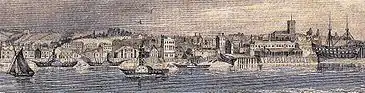 In the late 18th century, the population of Woolwich approached 10,000 and new areas for housing were found south of the main street. A new town centre comprising Beresford Square, Powis Street and the Bathway Quarter was laid out around 1800. The ropeyard closed in 1832 and the site was acquired by the Greenwich wine merchant George Smith. Three years later the area was cleared and Beresford Street was laid out. By 1847 the street had been fully developed with two-storey-houses (some double-fronted, one room deep), two public houses (Beresford Arms and Duke of Sussex), a theatre (Theatre Royal, later Woolwich Empire) and a chapel (Wesleyan Association Chapel; later followed by Baptist Tabernacle, Salvation Army Chapel and St Saviour's Mission). At the eastern end of the street, facing Beresford Square, Holy Trinity Church was built in 1833-34. This large Anglican church had an imposing façade in Portland stone with a stump tower above a Greek Revival portico.[9]