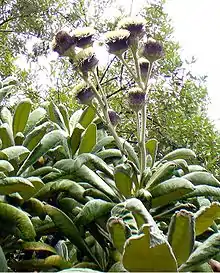 Oldenburgia grandis is a shrub or small, gnarled tree in the family Asteraceae. It occurs in the mountains around Grahamstown in South Africa. It grows to a height of about 5m on sandstone outcrops. It has thick corky bark and large leaves clustered at the ends of branches. The leaves are dark green and leathery, reminiscent of loquat leaves, but generally a good deal larger. The emergent leaves are densely and completely felted with white hair. Most of the felt is lost as the leaf matures, but some persists on under-surfaces. Flowers are white or purplish and borne in large heads some 5- to 12 cm in diameter. The flowerheads are terminal; The same plant may bear solitary heads, plus heads borne in loose, irregular panicles. It is threatened by habitat loss.