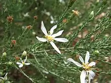 Olearia floribunda, commonly known as heath daisy-bush,[2] is a species of flowering plant in the family Asteraceae and is endemic to south-eastern Australia. It is an upright, spreading shrub with egg-shaped leaves and white and yellow or mauve, daisy-like inflorescences.