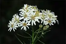 Olearia glandulosa, commonly known as swamp daisy-bush,[2] is a species of flowering plant in the family Asteraceae and is endemic to south-eastern Australia. It is a slender, erect, glabrous shrub with sticky, narrowly linear leaves and white or pale blue and yellow, daisy-like inflorescences.