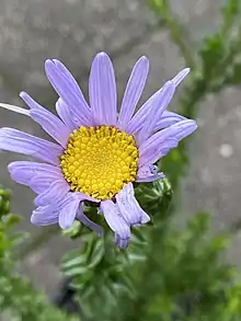 This daisy bush is listed as "not threatened" by the Department of Biodiversity, Conservation and Attractions.[2]