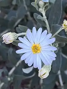 Dusty daisy-bush has varying colours with the most common being white but can be blue or pink. The flowers are in terminal clusters from the side branches about 15–25 mm (0.59–0.98 in) in diameter. The 4-5 bracts are bell-shaped to hemispherical, arranged in rows covered with short soft hairs, occasionally glandular. There are usually 10-14 ray florets on an individual "daisy" flowers and bloom in spring and early summer.[4] The fruit has 5 ribs 2–3 mm (0.079–0.12 in) long and has a single seed called an achene.[2][5][6][7][8]