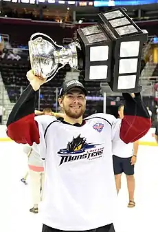 Upon returning to the AHL, Bjorkstrand helped the Monsters sweep the Rockford IceHogs in the first round by scoring 19 seconds into the third period of Game 4.[22] In Game 1 of the following series against the Grand Rapids Griffins, Bjorkstrand recorded the overtime game-winning goal to lead the Monsters to a win.[23] With assistance from his offensive ability, the Monsters qualified for the Calder Cup Finals against the Hershey Bears where he scored the game-winning goal in overtime of Game 4. This effectively won the Calder Cup for the Monsters, and Bjorkstrand also earned the Jack A. Butterfield Trophy as the playoffs' most valuable player.[24]
