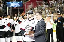 As a dual citizen of Denmark and the United States, Bjorkstrand has chosen to represent Denmark at international tournaments.[1] He represented Denmark for the first time internationally at the 2012 World Junior Ice Hockey Championships with his father serving as his head coach.[54] Bjorkstrand represented Denmark for the second time at the IIHF World Junior Championship in 2015 after helping them qualify in 2014.[55] During the IIHF World Junior Championship, Division I, Group A tournament, he was named the tournament's Top Forward by the IIHF Directorate.[56] In the same year, Bjorkstrand also made his first senior appearance with the Denmark men's national ice hockey team at the 2015 IIHF World Championship at the age of 20[57] alongside his brother Patrick.[58]