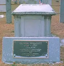 Wolcott died on December 1, 1797, in Litchfield,[1][13][14] where he is interred at East Cemetery. Historian Ellsworth Grant remembers Wolcott's Revolutionary War efforts in stating that, "It is doubtful if any other official in Connecticut during this period carried so many public duties on his shoulders."[10]