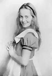 In 1933, a teenage de Havilland made her debut in amateur theatre in Alice in Wonderland, a production of the Saratoga Community Players based on the novel by Lewis Carroll.[22] She also appeared in several school plays, including The Merchant of Venice and Hansel and Gretel.[24] Her passion for drama eventually led to a confrontation with her stepfather, who forbade her from participating in further extracurricular activities.[25] When he learned that she had won the lead role of Elizabeth Bennet in a school fund-raising production of Jane Austen's Pride and Prejudice, he told her that she had to choose between staying at home, or appearing in the production and not being allowed home.[25] Not wanting to let her school and classmates down, she left home, moving in with a family friend.[25]