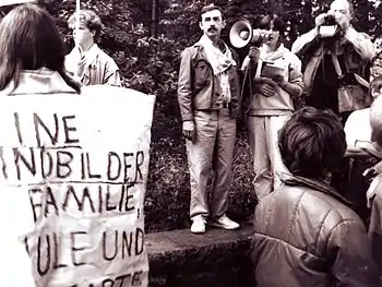 At the same time all sorts of supportive events took place independently in towns and villages away from the route of the march, most of which were organised by the Church. A major demonstration took place on 5 September in Prenzlauer Berg on the south side of Berlin, with around 1,000 participants proceeding from the Zion Church in Berlin's Rosenthaler suburb to the Gethsemane Church in Pankow.[2]