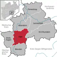 Olpe is a town situated in the foothills of the Ebbegebirge in North Rhine-Westphalia, roughly 60 km east of Cologne and 20 km northwest of Siegen. It is part of the Regierungsbezirk of Arnsberg and is the seat of the district of Olpe.