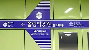 Olympic Park is a subway station on Seoul Subway Line 5 and Seoul Subway Line 9 in Songpa-gu, Seoul.[3][1][4][5] It became an interchange with Subway Line 9 on December 1, 2018.[2]