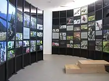 The design of the exhibition was designed by the Goulandris Museum of Natural History.[2] The exhibition is divided into seven areas, in which the peculiarities of the seven different zones of the mountain are presented, one will find large-sized boards that provide information about relevant topics in Greek and English. With every rise in the exhibition, the next higher altitude of the mountains is shown and the plant and animal world prevailing there is explained. Places of interest beyond nature are treated on separate boards, information about archaeological sites such as Dion or Leivithra is provided. The hiker is pointed out to interesting places near the hiking trails, such as the monastery of Agios Dionysius or the cave of the painter Ithakisios.