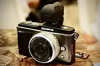 ![]() Olympus PEN E-P2 shown with the Olympus M.Zuiko 17 mm lens and optional electronic viewfinder | |