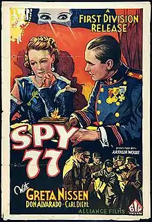 On Secret Service is a 1933 British thriller film directed by Arthur B. Woods and starring Greta Nissen, Karl Ludwig Diehl, Don Alvarado, and Austin Trevor.[1] It was produced by British International Pictures.[2] It is based on the 1933 German film Spies at Work[3] with Karl Ludwig Diehl repeating his role from that film. On Secret Service premiered in London on 15 December 1933 and was theatrically released on 21 May 1934. In the United States, the film was released on 9 February 1936 as Spy 77.[1]