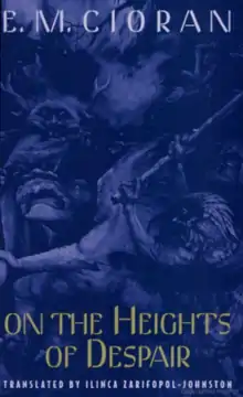 On the Heights of Despair (Romanian: Pe culmile disperării) is a 1934 non-fiction book by philosopher Emil Cioran, that was translated from Romanian into English in 1996 by Ilinca Zarifopol-Johnston, who also wrote the book's English-language introduction. The first work that Cioran published, it is a series of short essays, dealing with themes that would later permeate his work, such as death, insomnia and insanity. On the Heights of Despair received the King Carol II Royal Foundation's Young Writer's Prize.[1] This was the only award that Cioran himself accepted – his later works would win the awards for the Prix Rogier Namier and Grand prix de littérature Paul-Morand, but he refused both of them.[2]
