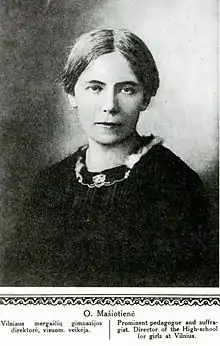 Ona Mašiotienė née Brazauskaitė (9 September 1883 – 29 December 1949) was a Lithuanian teacher and principal, women's rights activist and writer. She helped found the Lithuanian Women's Association, the first women's rights organization in the country, and lectured on the need for equality of men and women. Pressing for both women's rights and Lithuania's independence, she served as a member of different societies and a delegate to several political conferences and assemblies. As a teacher, she organized the first Lithuanian-language girls' gymnasium in Vilnius and was the principal of a secondary school in Kaunas for over a decade. In 1921, she was elected to serve on the Utena regional council for two terms. She was one of the co-founders and the first president of the umbrella Lithuanian Women's Council. Recognized by the independent Lithuanian government with national awards, she was dismissed from her teaching post after the Soviets reestablished authority over the country.