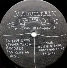 "One Beer" is a song recorded by American hip hop duo Madvillain, originally intended for inclusion on their debut studio album Madvillainy.[1] The song instead ended up being used on MF Doom's 2004 album Mm..Food, credited to MF Doom instead of Madvillain.[2] "One Beer" was released as a limited-press 7" single in 2004, given away by select online retailers with copies of Madvillainy.[3] An animated music video was released on 16 November 2018, 14 years after Mm..Food's release.[4]