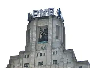 The Philadelphia National Bank's initials adorned the top of the building, surrounding the top of the structure's bell tower, until 2014. The letters, which were made of 16 feet (4.9 m) stainless steel, each weighed 3,000 pounds (1,400 kg). Until the 1970s, PNB used the sign to forecast weather by lighting the letters in red to indicate a warming trend, or green to predict the opposite.[17] Wachovia considered removing the PNB sign in 2003 to replace it with its own signage, but, in response, some Philadelphians expressed nostalgia for the name of the former Philadelphia institution and hoped the sign would stay. The Philadelphia Historical Commission stated that the sign was not an integral part of the building's design or as significant to the city as the nearby PSFS Building's sign.[17] On August 17, 2014, three of the PNB letters were removed from the building by helicopter, and the remaining nine were removed the following November 16.[22]