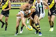 A spoil is preventing an opposition player from taking clean possession of a pass from a team-mate. This is most usually done by punching the ball away from the contest. In the 2011 semi-final against Sydney, Hawthorn defender Josh Gibson compiled an AFL record 21 spoils.[1]
