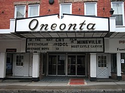 Oneonta Theatre is a historic theatre building located at Oneonta in Otsego County, New York. The original structure was built about 1897 and expanded in several stages. The original three story structure was a generally rectangular block with storefronts and theater entrance on the first floor and apartments above. A theater wing projected from the rear was set at a 45-degree angle. In 1922, the theater was expanded and the entrance relocated to the center of the building. The 1922 marquee was removed in the 1970s.[2]