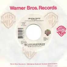 "Only Love Can Save Me Now" is a song written by Tom Shapiro, Chris Waters and Bucky Jones, and recorded by American country music artist Crystal Gayle. Originally included on her 1986 studio album Straight to the Heart, it was released in October 1987 as the only single from the compilation album The Best of Crystal Gayle. The song reached number 11 on the Billboard Hot Country Singles & Tracks chart.[1]