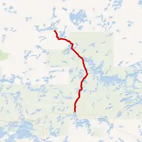 Approaching Ear Falls, the route intersects Highway 804, which branches west to the Manitou Falls hydroelectric dam. Within Ear Falls, it crosses adjacent to the 29.3 megawatt Obishikokaang Waasiganikewigamig Generating Station at the outlet of Lac Seul into the English River.[8] Immediately to the north, Highway 657 branches east to the former Hudson Bay Company fur trading outpost at Goldpines, now home to several fishing and camping lodges.[9][10] Approximately 20 km (12 mi) north of Ear Falls, Highway 105 passes east of Pakwash Provincial Park and through the community of Snake River.[6] As the route approaches Red Lake from the east, it encounters Highway 125, which branches north to Balmerton and Cochenour,[6] as well as the Red Lake Airport (CYRL), once the busiest airport in the world.[11] After swerving through Red Lake, the highway ends at Howey Street, which continues west as Highway 618 to several mines and the community of Madsen.[6][5]