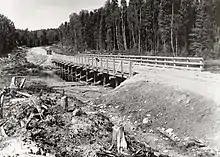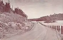 Highway 105 was officially opened in a ceremony attended by Ontario premier George A. Drew and minister George Doucett on August 27, 1947. The ceremony took place at Perrault Falls, where minister Doucett broke through the final barrier on the highway, followed by the playing of the national anthem. Minister Doucett was given a bear cub by one of the construction companies for all his efforts towards the creation of the route.[2] The new road was gravel surfaced its entire length,[15] which quickly gave rise to numerous potholes. By the 1960s, the provincial government was once again being pressured to improve access to Red Lake. Construction began to pave the route in 1962 and was completed in the summer of 1967.[2][16] Aside from minor realignments, Highway 105 has remained unchanged since then.[6]