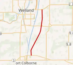 Highway 140 begins at an intersection with Highway 3 on the eastern edge of Port Colborne. From there, Highway 3 continues east to Fort Erie; to the west it becomes Niagara Regional Road 3.[3] The roadway carrying Highway 140 continues south of Highway 3 as a local road named Elizabeth Street, whereas Highway 140 travels north, to the west of forestland and a quarry. The highway parallels the Welland Canal throughout its length, always within 2 kilometres (1.2 mi) of the waterway.[4][5] Wooden high-tension powerlines parallel the highway until it diverges, curving towards the northeast immediately north of Chippawa Road. It travels diagonally for several kilometres before ascending on an overpass and crossing the former Canadian National Humberstone Subdivision tracks.[6]