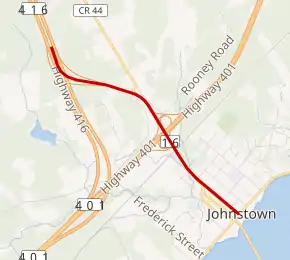 Highway 16 is now a very brief route, though it was much longer before the construction of Highway 416 truncated it. The highway begins near the shores of the St. Lawrence River in Johnstown at the former Highway 2, now Leeds and Grenville County Road 2.[19] From there it travels northwest adjacent to the Ogdensburg-Prescott International Bridge, which lies to the southwest. A customs plaza lies at the end of the bridge, north of which the road to the bridge meets the highway; to the northeast is single-detached housing. The highway continues, exiting Johnstown and curving slightly towards the north.[20]