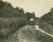 Early impetus for a route connecting Ottawa to the St. Lawrence River began with lobbying by automobile clubs in the early 1910s.[2][3] The Prescott Highway was established as a provincial highway in 1918, shortly after The Provincial Highway (which would become Highway 2). The 92.7 km (57.6 mi) Ottawa–Prescott Highway was assumed by the Department of Public Highways (DPHO) on August 15.[4] The new route was initially in an unfit condition for traffic. For example, the 1918 DPHO Annual Report noted that in North Gower Township, the road "was in places very narrow and the sides grown up with brush and small trees. The road surface was in very bad shape."[5] Work began immediately to clear, widen, grade, and gravel the route, which was in many cases only 10 m (33 ft)-wide from overgrown fence line to overgrown fence line.[6] Paving began in 1922, from the Central Experimental Farm in Ottawa southerly approximately 6.5 km (4.0 mi).[7] By mid-1923, the route was paved through Spencerville and North Gower, and work was underway to pave it within Manotick.[8]
