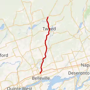 Highway 37 is a 44.2 km (27.5 mi) road between Highway 401 at Belleville and Highway 7 at Actinolite that serves as a shortcut between Toronto and Ottawa.[1][3] Lying entirely within Hastings County, the route travels parallel to the Moira River throughout its length. Outside of the communities that it cuts through, the majority of surrounding land use is agricultural, though forest is dominant near the Moira River.[4][5] Traffic levels along Highway 37 taper gradually from south to north, and increase by approximately 144% in the summer months compared to winter months. On an average day, 9,150 vehicles travel the route immediately north of Highway 401, and 3,150 vehicles travel the route north of the village of Tweed. These represent the heaviest and lightest travelled portions of the route, respectively.[1]