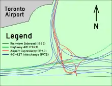 During the early 1960s, Toronto International Airport was expanded with the construction of the Aeroquay One terminal.[18] To serve the expected demand of the expansion, the DHO built a new four-lane freeway north from Highway 401 at Renforth Drive. This new route, which roughly followed the same route as today's Highway 427 as far as Dixon/Airport Roads where it tied in with and downgraded into Indian Line,[19] was known as the Toronto Airport Expressway and was opened on January 3, 1964.[20][21] It featured a connection with the western terminus of Richview Sideroad at the southern end of the interchange with Highway 401 as well as an interchange with Renforth Drive.[20]
