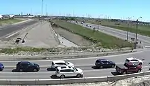 The junction with Highway 401 remains the largest interchange in Canada as it sprawls over 156 ha (385 acres) and required the construction of 28 bridges and the equivalent of 46.6 km (29 mi) of two-lane roadway, being built around the existing Richview Memorial Cemetery, and including connections to Eglinton Avenue (ultimately meant for the proposed but never-built municipal Richview Expressway).[26] The interchange with the QEW was opened to traffic on November 14, 1969,[27] while the Highway 401 junction required several more years of construction staging, fully opening on December 4, 1971 (though portions were opened in the weeks prior to that), just prior to Highway 27's renumbering as Highway 427. The rest of the route was rebuilt prior to the completion of these interchanges.[1][28]
