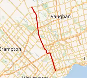 From here to just south of Finch Avenue, the freeway follows the boundary line between Toronto and Mississauga.[6] It encounters the third multi-level junction along its length, with Highway 409, which provides access to the airport as well as the southbound to eastbound movement that cannot be performed at the interchange with Highway 401 to the south.[5] Highway 427 continues straight north and narrows again to six lanes.[5] After crossing the Kitchener GO line, it passes west of Woodbine Racetrack and interchanges with Rexdale Boulevard/Derry Road and Finch Avenue. The freeway bends slightly eastward, diverging from the Toronto/Mississauga boundary to briefly run exclusively through Toronto again. It crosses the West Humber River where it drains from Claireville Reservoir.[6] The highway crosses Steeles Avenue and enters Vaughan, as it approaches a fourth and final sprawling interchange with Highway 407.[5] It then interchanges with Highway 7 (York Regional Road 7), Langstaff Road (Regional Road 72), Rutherford Road (Regional Road 73), and ends at a trumpet interchange with Major MacKenzie Drive (Regional Road 25).