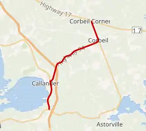 Highway 94 is a 12.0-kilometre (7.5 mi) route that begins at Highway 654 south of Callander, adjacent to an interchange with Highway 11. The route travels north from there, somewhat parallel to the divided four lane Highway 11 to the east. Bypassing east of Callander, Highway 94 turns east at Lansdowne Street. It curves northeast and crosses Highway 11. Weaving east and northeast, the highway passes through an area dominated by thick forests, though residences regularly dot both sides of the highway. Straightening to an eastward orientation, the highway approaches Corbeil, but makes a sharp 90 degree curve to the north. After crossing railway tracks, the route continues north for 1.9 kilometres (1.2 mi) before terminating at Highway 17. Highway 94 is situated entirely within Nipissing District. The Highway is longer north-south than it is east west, but it is signed as an east-west highway.[3]
