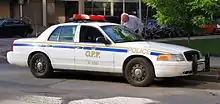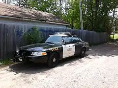 Historically, from 1941 to 1989, the OPP livery was black and white. In 1989, in response to manufacturers no longer offering dual tone vehicles, the OPP switched to an all-white livery with blue and gold striping.[23] Vehicles of this era were equipped with Federal Signal's Vector light bars with integrated traffic advisers. In 2007, the OPP announced that it would return to a black and white colour scheme. The colour scheme is accomplished with the use of vinyl wraps during in-house vehicle outfitting. The change was implemented starting in March 2007 and was completed in 2009. Vehicles of this era had detachment markings on the rear quarter panel and used Federal Signal Arjent S2 light bars. Current vehicles have eschewed the detachment markings and are equipped with Whelen Legacy light bars. Unmarked vehicles are generally white, black, grey or dark blue. All marked cruisers are equipped with pushbars, also generally have black steel rims, and spotlights mounted on the driver side. Licence plates on the cruisers are generally the standard Ontario licence plates with a special validation sticker denoting permanent registration.[24]