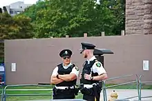 Special constable uniforms consist of a white shirt, black tactical vest, radio, black pants with yellow stripe and peaked cap. Peace officers wear similar uniforms, but with black shirts and black pants with single red stripes. They also carry the OPP's standard issue sidearm – a Glock 17M pistol in 9x19mm – for protection. In the event of a dangerous incident, tactical assistance is provided by the Emergency Service Unit of the Toronto Police Service, whose headquarters is proximate to the precinct on College Street. For an immediate response, officers may also access tactical weaponry from the Queen's Park armoury located within the legislature building.
