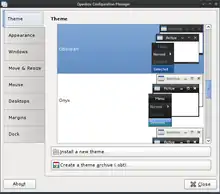 Openbox is designed to be small, fast, and fully compliant with the Inter-Client Communication Conventions Manual (ICCCM) and Extended Window Manager Hints (EWMH).[7] It supports many features such as menus by which the user can control applications or which display various dynamic information.[5]