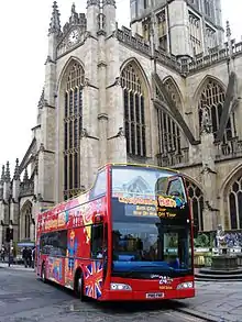 City tours started to become popular during the 1970s. London Transport purchased seven convertible Daimler Fleetlines from Bournemouth in October 1977 which were placed on a London sightseeing tour.[10] While some city tours were operated just a couple of times each day by one vehicle, the more popular cities saw intense competition, especially after bus services were deregulated in 1986. Badgerline in Bath was carrying up to 150,000 passengers annually[6] but rival tours have been operated by the Bath Bus Company since 1997[11] and Ryan’s Coaches 'City Tour' and Regency Tours offered further competition.[12]